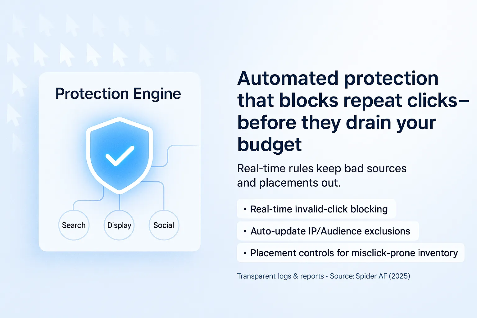 Repeated‑click fraud quietly drains budgets and corrupts optimization. Pair platform hygiene (IP/audience exclusions, schedule and geo tightening, placement reviews) with automated, real‑time enforcement.